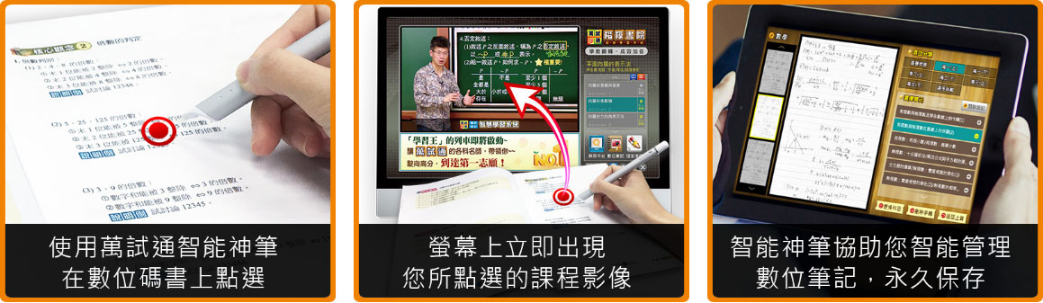 | 除了擁有PC&TV專利寶盒的學習系統外,學習王科技的研發團隊更於2016年五月推出學習智能筆,結合最新科技的智能筆,真正將學生的學習數位化,透過智能筆的書寫讓上課的筆記也能利用編碼筆記與藍芽技術輕鬆整合到萬試通智慧學習系統內,讓學習紀錄是融貫的、是整合的、是真正數位化的。甚至學習中有任何的問題,只要輕點講義中的文字,系統立即帶出該章節的影音課程,讓學生立即就不明瞭之處學習、解惑。學習王科技推出領先業界的智能筆技術整合,並不是在譁眾取寵;而是我們堅信保持書寫與做筆記的習慣是有助於學生學習的成效。筆書乃中華文化千年的傳統,『筆書相會、名師相隨』則是學習王科技提供給學生的數位化學習承諾。 |